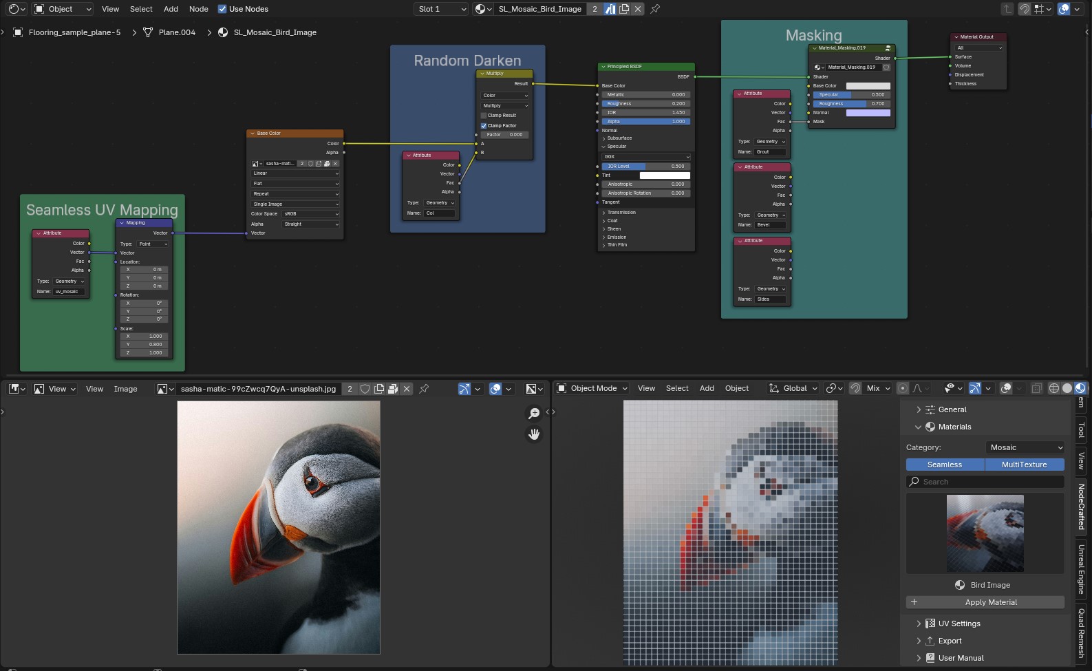 The uv_mosaic attribute enables creating mosaic materials or applying advanced masking. [SHADER SAMPLE]
