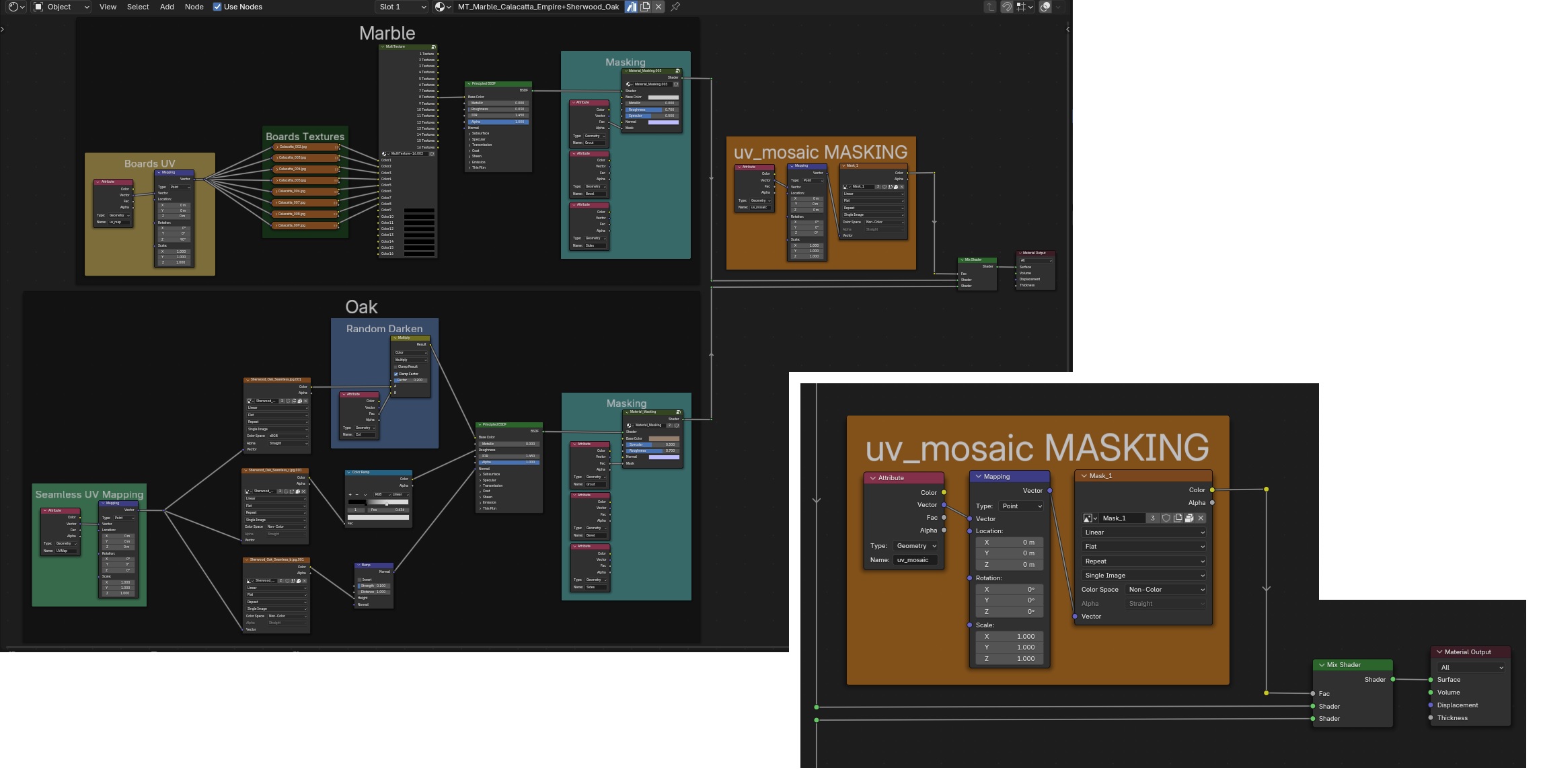 Use uv_mosaic attribute as a Mapping Node vector input to mask shaders. [SHADER SAMPLE]