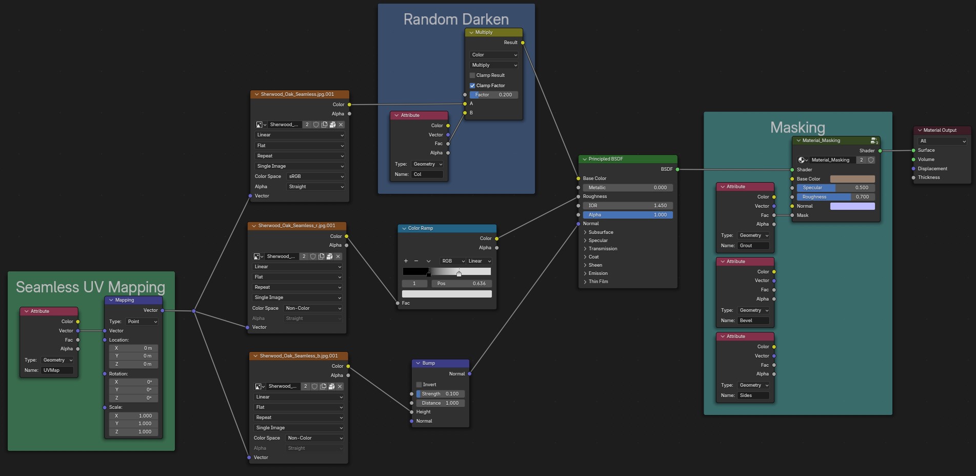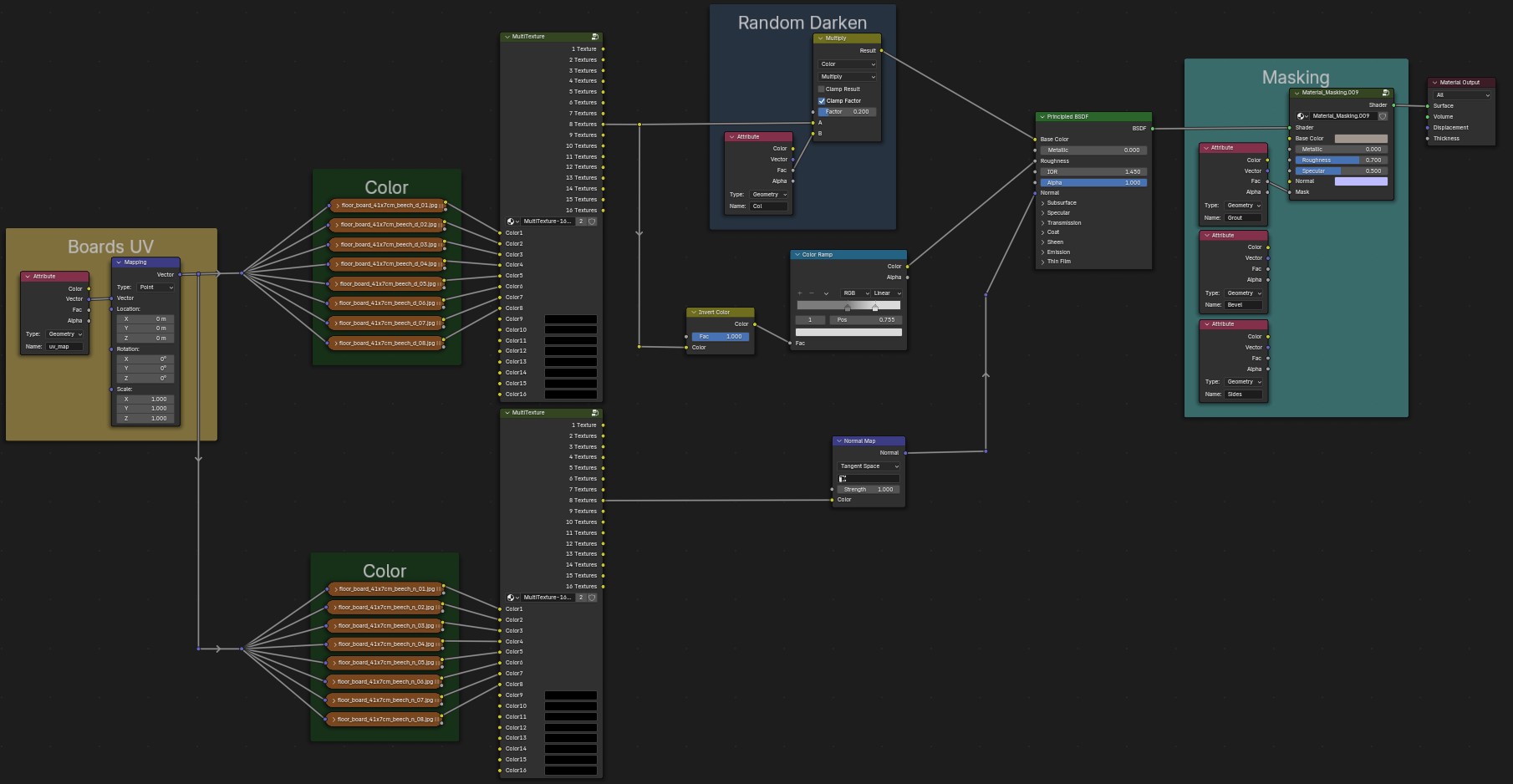 The specially developed MultiTexture Node lets you add up to 16 textures to each shader input, automatically distributing them randomly across the floorboards for natural variation. [SHADER SAMPLE]